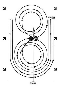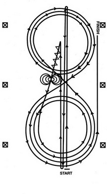 3. Começando na ponta direita, complete dois círculos para a direita: o primeiro sendo grande e rápido; o segundo círculo pequeno e lento. Pare no centro da arena. Pausa.